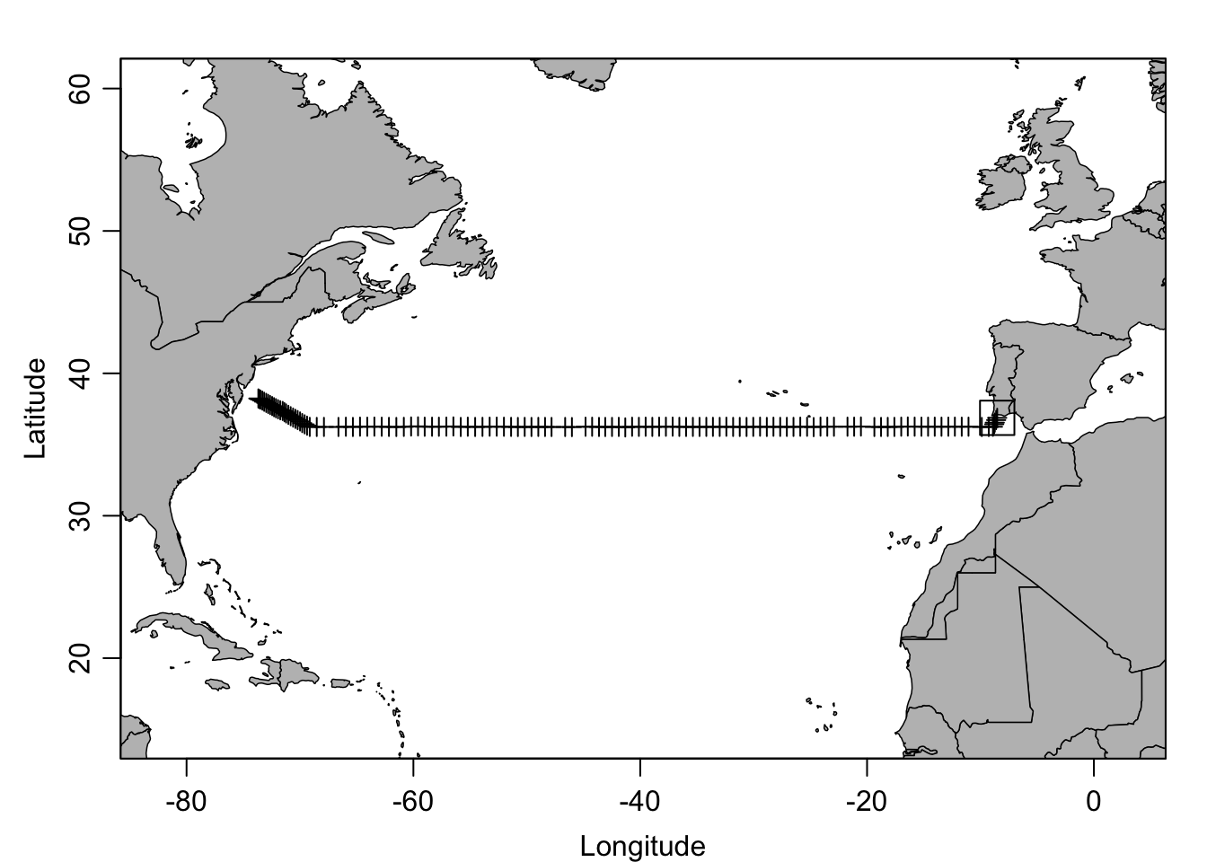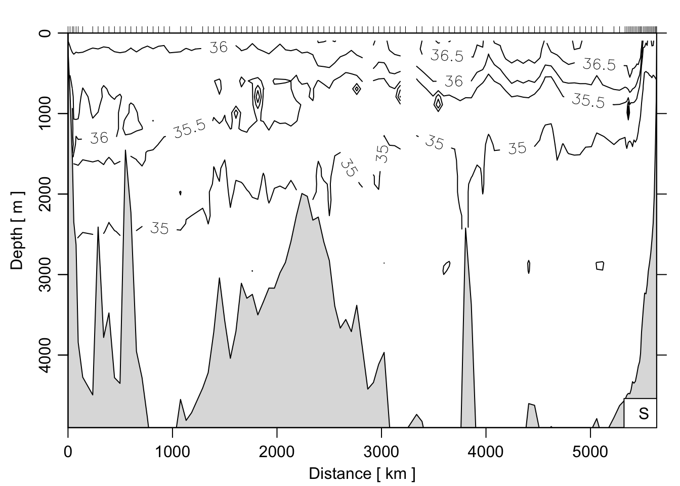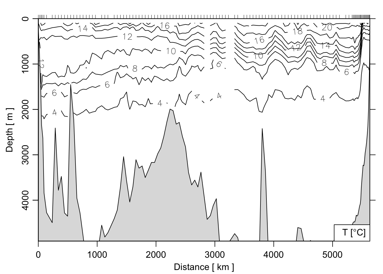In der Ozeanographie werden häufig mehrere CTD-Stationen entlang einer Linie (Transekt) zu einem „Schnitt” (Section) zusammengefasst und als vertikaler Querschnitt dargestellt. oce enthält den Beispieldatensatz section — einen Schnitt durch den Atlantik mit über 100 Stationen.