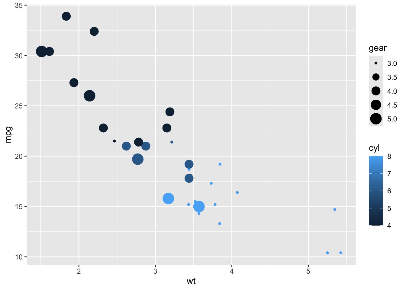 p <- ggplot(data = mtcars, aes(x = wt, y = mpg, size = gear, colour = cyl)) +
