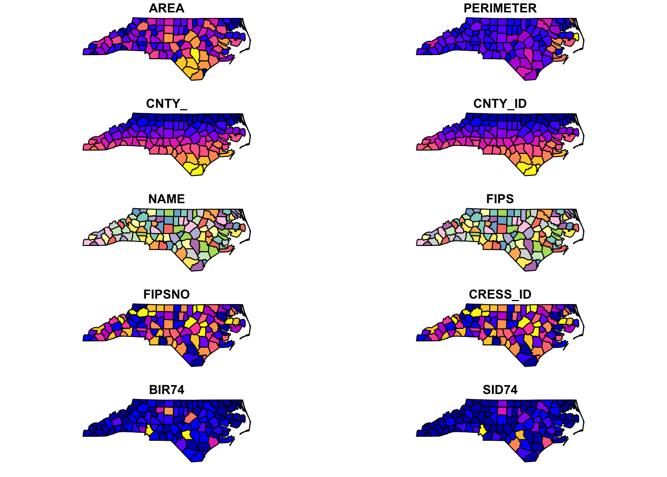 colnames(nc) [1] "AREA" "PERIMETER" "CNTY_" "CNTY_ID" "NAME" "FIPS"